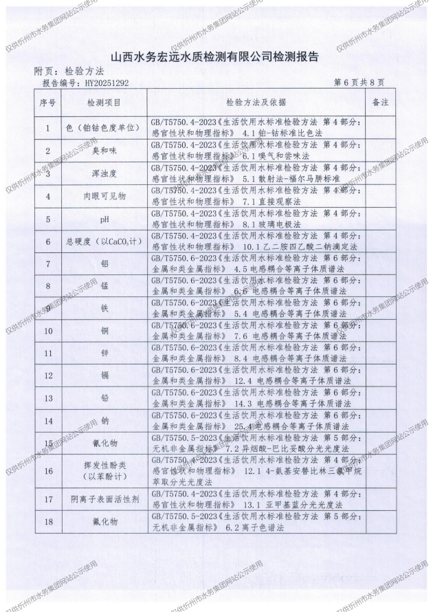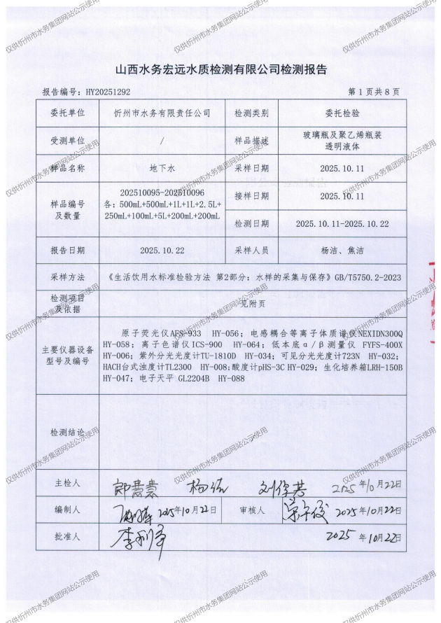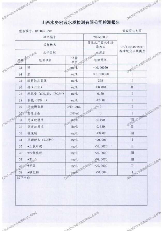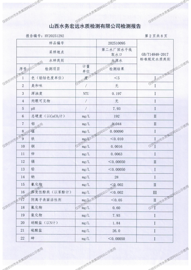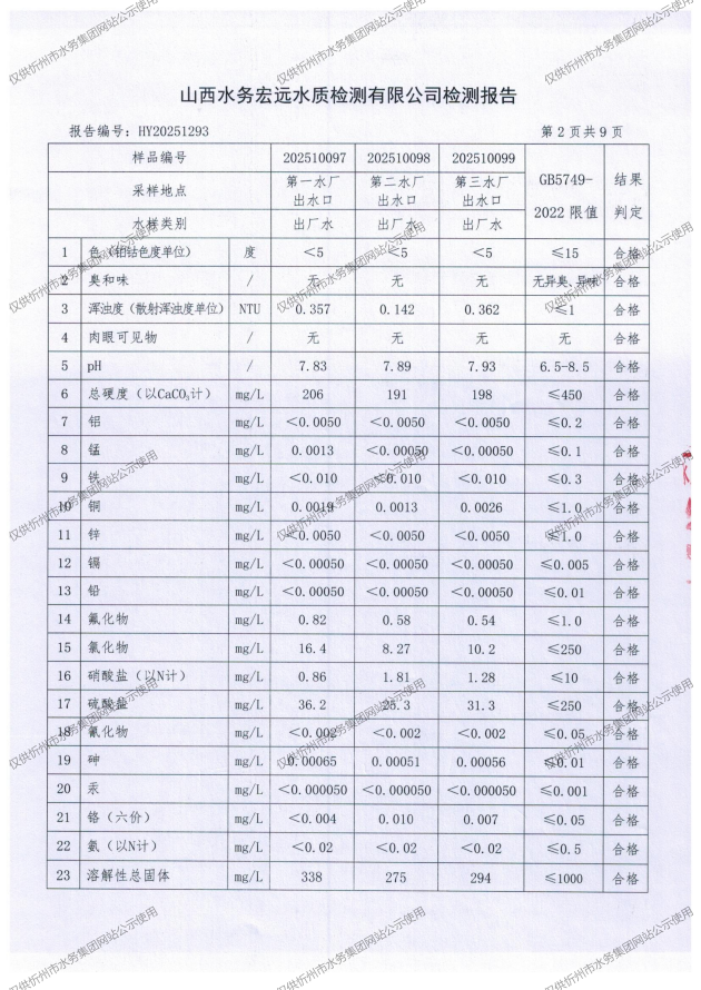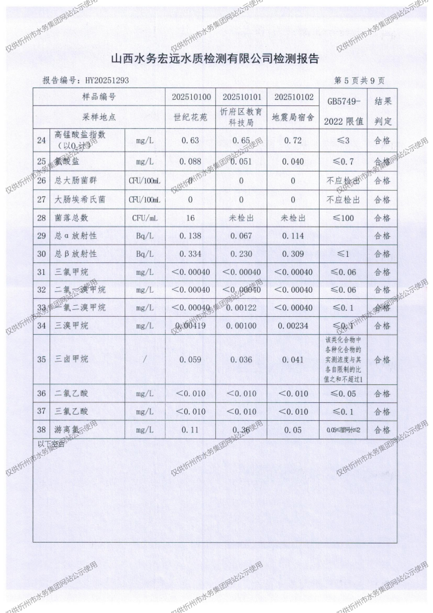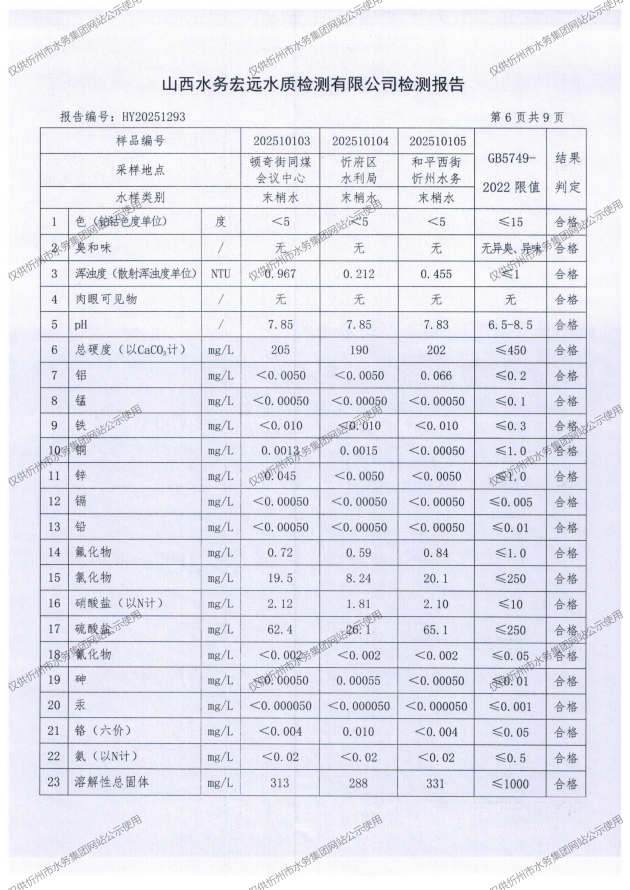 忻州城區(qū)公共供水水源水、出廠水、管網(wǎng)水、管網(wǎng)末梢水2025年10月份水質(zhì)信息公示