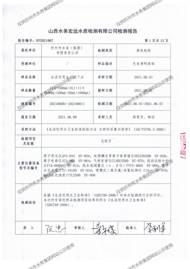 忻州城區(qū)公共供水水源水、出廠水、管網(wǎng)水、管網(wǎng)末梢水2021年6月份水質信息公示